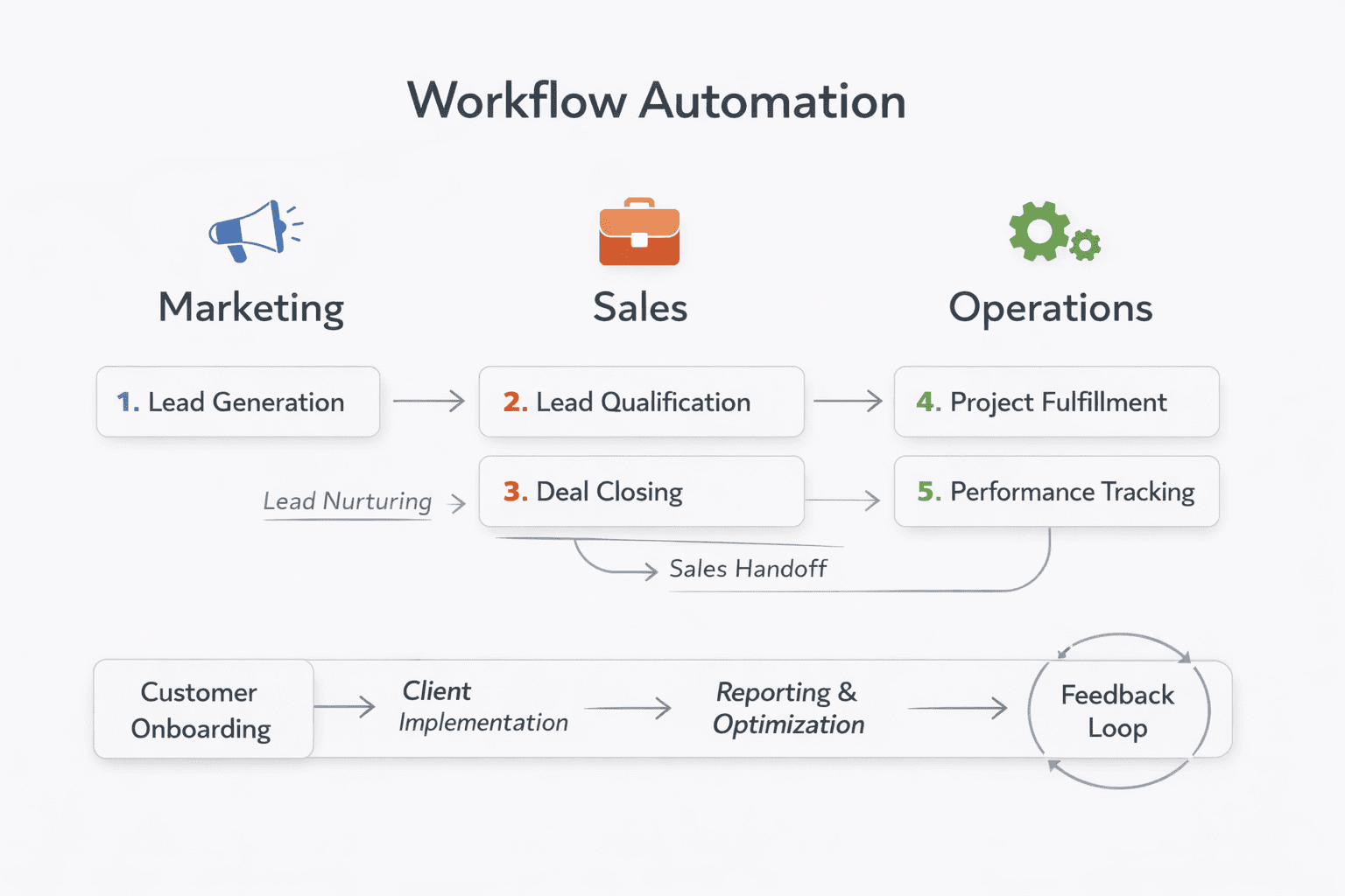 Our AI and automation solutions connect your marketing, sales, and operations into one smooth system. We build workflows that reduce repetitive tasks, improve customer journeys, and increase efficiency.