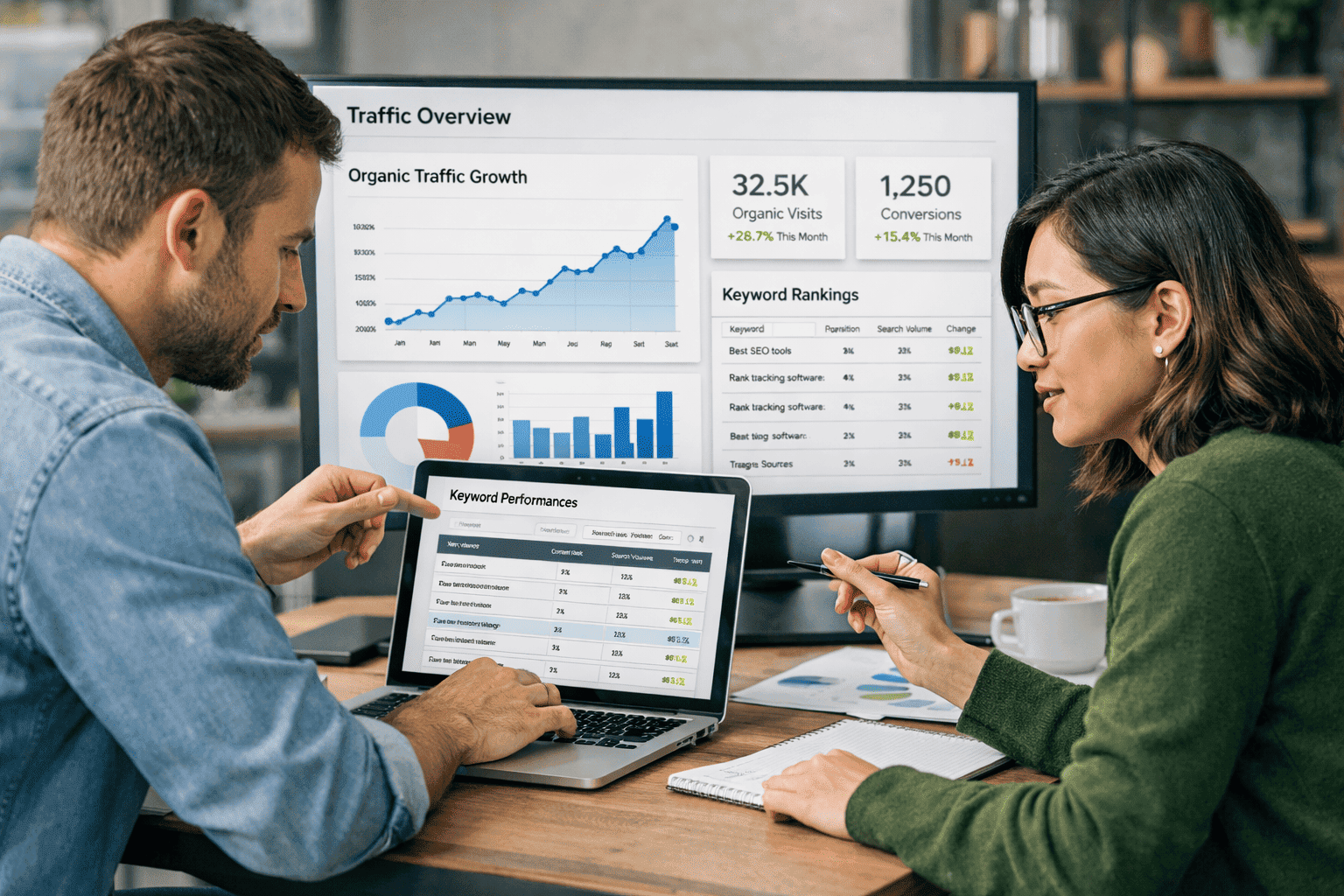 Monthly updates with rankings, traffic, and key improvements.